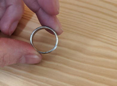 He started by explaining the different steps of the process before we practiced cuts and patterns on copper strips (cheaper). Then we started working on our own jewellery. I chose to do a simple ring using some lace ribbon and oxidation to create the pattern.